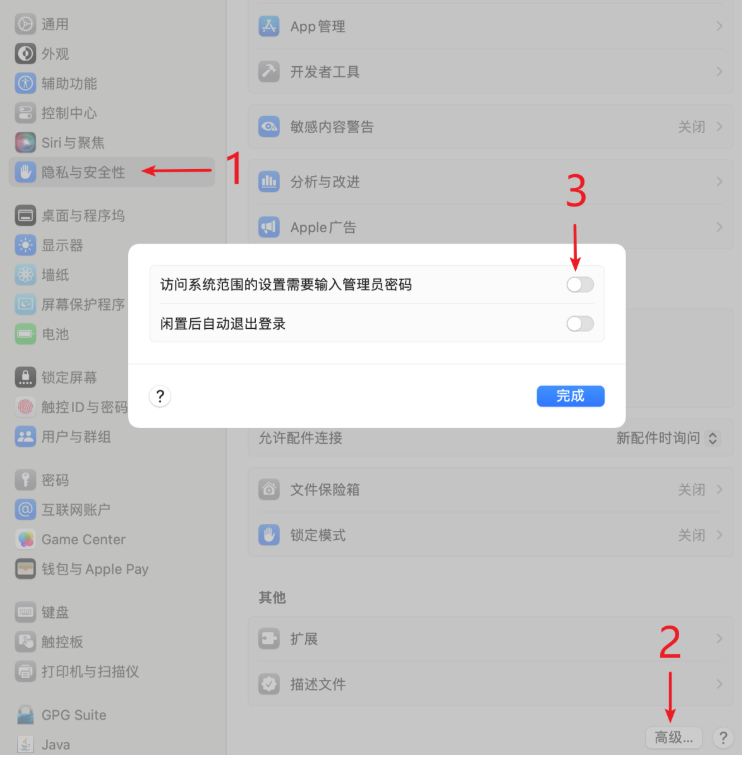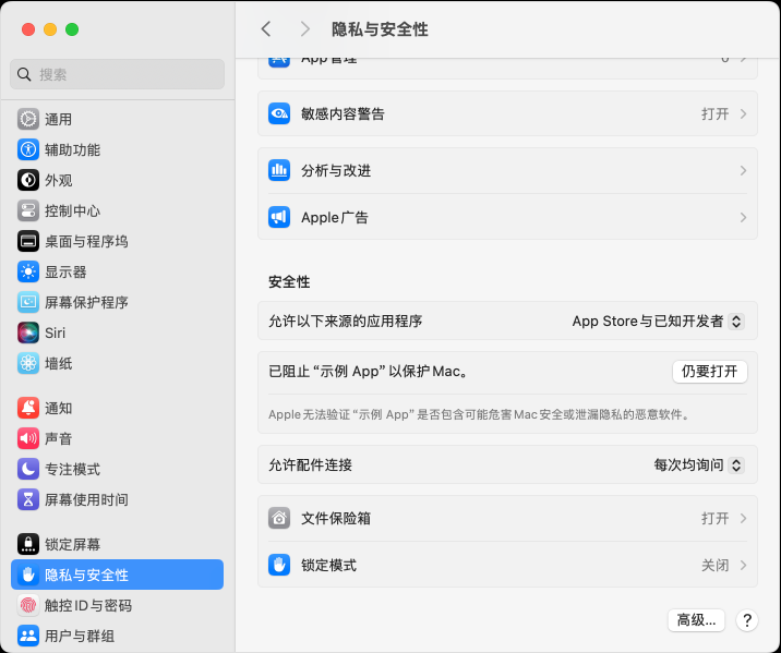 ## 1. 下载软件 [点击下载(更新时间2026-04-16):AppleGame-macos-2.4.2.pkg](https://file.747747.xyz/directlink/1/new_client/2.4.2/AppleGame-macos-2.4.2.pkg) >w 一定能要完成步骤2和3 不然无法使用!!! > > ## 2. 安装不了提示可能危害安全 >d **郑重承诺** > > 软件无任何恶意代码,不会获取任何个人信息,只是未取得官方认证! > --- >s **解决办法** > > 1.打开“系统设置” >2.点按“隐私与安全性”,向下滚动,然后点按“仍要打开”按钮,以确认你要打开或安装这个 App。 > >现在,这个 App 会作为安全性设置例外项目存储在系统中,以后你可以像使用任何经过授权的 App 一样,连按两下来打开这个 App。 ## 3. 安装好后,节点连接上了,但是无法使用 >w **问题原因** > >更改锁定的系统偏好设置需要管理员密码,当前可能处于普通权限。 >s **解决方案** > > 系统偏好设置 -> 安全性与隐私 -> 高级,==关闭== 访问系统范围偏好设置需要输入管理员密码 (不同系统版本的名称略有差异),点击 完成 。 >